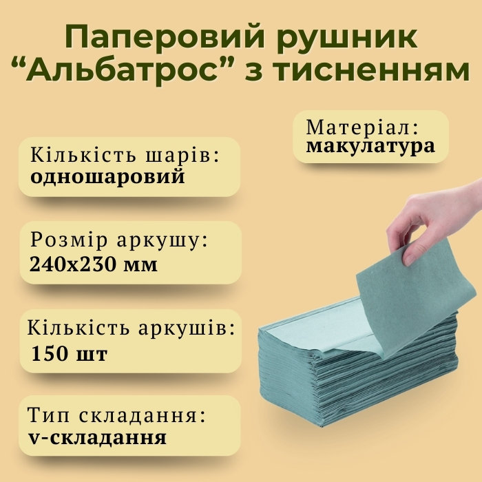 Паперові рушники Альбатрос, v-складання, з тисненням, зелений - призначені для повсякденного гігієнічного та побутового використання. Допомагають позбутися надлишків жиру, вологи, пилу та інших забруднень з будь-якої поверхні. Прекрасна альтернатива електросушарку для рук. 100% целюлоза.