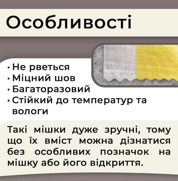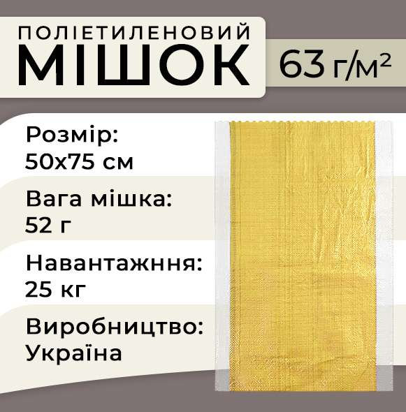 Поліпропіленові мішки розміром 50х75 см виготовлені з високоміцного тканого поліпропілену, стійкого до розривів і стирання.Цей тип поліпропіленових мішків відрізняється своєю преміум якістю. Завдяки високій щільності ниток, з яких виробляється мішок, та унікальній технології їх переплетення вони по своїй міцності можуть зрівнятися навіть з канатом! Використання прозорих вставок робить такі мішки дуже зручними, тому що їх вміст можна дізнатися без особливих позначок на мішку або його відкриття. Крім того, наявність кольорових смуг дозволить розмежувати товари різних категорій та сортів.Вони призначені для фасування та транспортування сипучих матеріалів (круп, цукру, борошна), комбікормів, насіння й невеликих будівельних сумішей. Легко складається в рулон для зберігання та швидкого дозакладання. Завдяки міцності й вологостійкості, поліпропіленові мішки використовують у сільському господарстві, харчовій та будівельній промисловості, логістиці й складському зберіганні.