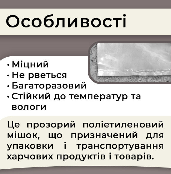 Поліетиленові харчові мішки розміром 65х110 см виготовлені з харчового поліетилену високої щільності, що гарантує їхню безпеку для упаковки продуктів. Прозорий матеріал дозволяє легко контролювати вміст, а міцні шви захищають від протікання та розривів. Ідеально підходять для фасування сипучих продуктів (борошна, круп, цукру), м’ясних виробів, овочів та фруктів, а також для зберігання та транспортування готових страв. Такий мішок використовується у домашньому господарстві, в магазинах та супермаркетах.