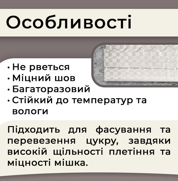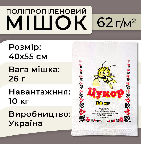 Міцні поліпропіленові мішки 40х55 см, щільністю 62 г/м2, оптимальні для пакування цукру до 10 кг. Внутрішнє ламінування перешкоджає проникненню пилу й вологи, а посилені краї з двома швами забезпечують довговічність навіть при багаторазовому відкритті. Завдяки широкій прорізній ручці мішок зручно тримати та переносити навіть при максимальному завантаженні.