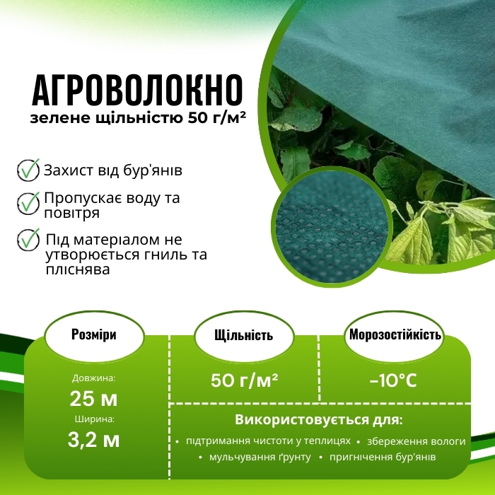 Полотно темно зеленого кольору, що має однорідну структуру. Легкий і міцний, екологічно чистий матеріал. Завдяки наявності технічного вуглецю матеріал поглинає більшу кількість тепла, це дозволяє забезпечити швидке прогрівання ґрунту. Бур'яни та їх насіння, знаходячись під темним мульчуючим матеріалом не отримують необхідної кількості світла і гинуть. Структура матеріалу мульчі дозволяє виробляти полив і вносити рідкі добрива.