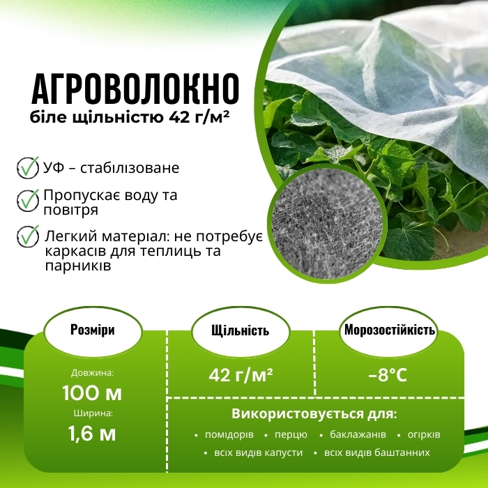 Агроволокно AGREEN, виготовлене за унікальною технологією з'єднання полотен, завдяки якій, незалежно від розміру, має однаково високу міцність на розрив. Це не лише безпосередньо впливає на врожайність, а й дає вам змогу використовувати агроволокно довше, що знижує собівартість врожаю. Рівномірна щільності матеріалу, гарантує досягнення стабільного температурного режиму, та вологості по всій площі вкритої грядки, що захищає рослини під час нічних заморозків.