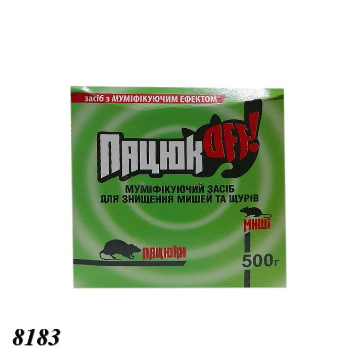 Зернова приманка з ароматом арахісу та сиру, червоного та жовтого кольору Пацюк OFF застосовується для знищення щурів та мишей у житлових та нежитлових приміщеннях, на підприємствах, у медичних закладах, у сховищах та на присадибних ділянках. Пацюк OFF містить у складі діючу речовину – бродифакум. Потрапляючи в організм тварини, цей синтетичний антикоагулянт крові порушує утворення вітаміну K1, необхідного для розвитку білків протромбінового комплексу. Через одну добу після вживання препарату у гризуна різко знижується рівень зсідання крові. Внаслідок цього будь-яке пошкодження гризуна призводить до внутрішньої кровотечі та загибелі тварини протягом 1-7 днів. Через відстрочену дію родентициду у гризунів не виникає різко виражених симптомів отруєння, що не викликає підозри та реакції страху приманки в інших особин. Засіб має у складі ароматизатори, що приманюють, і смакові компоненти, а також муміфікатор, який позбавить від неприємного запаху загиблих гризунів.