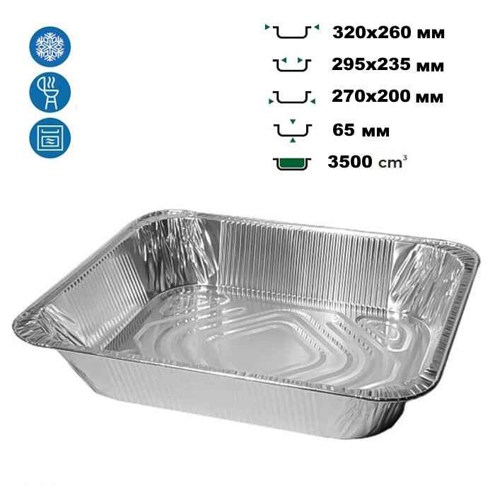 Алюмінієвий контейнер 3500 мл — це зручна одноразова тара для приготування, зберігання, запікання та транспортування гарячих і холодних страв. Контейнер виготовлений з харчової алюмінієвої фольги, яка стійка до високих температур, не змінює смак продуктів і підходить для духовок, грилів та морозильних камер. Ідеально підходить для HoReCa, кейтерингу, доставки їжі, а також побутового використання.