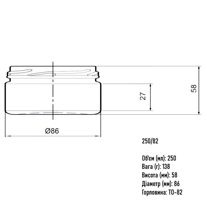 Циліндрична скляна банка об’ємом до 250 мл із класичним вінчиком ТО 82 мм. Прозоре харчове скло дозволяє чітко контролювати колір і структуру вмісту, а рівні стінки забезпечують акуратне наклеювання етикетки. Ідеально підходить для домашньої та промислової консервації ікри, рибних салатів, паштетів, соусів та делікатесних закусок. Банка витримує багаторазову стерилізацію й пастеризацію, гарантує герметичне закриття кришкою.