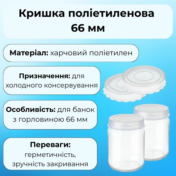 Капронові кришки підійдуть для скляних банок різного об’єму з горловиною 66 мм.