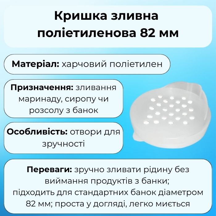 Кришки відрізняються ергономічною формою – вони мають щілини для зливу і носик, який спрощує процес переливання, направляючи струмінь. Такі кришки щільно насаджуються на горловину банки. У разі відкривання банки зливна кришка легко знімається, завдяки спеціальному вушку, за яке зручно тягнути.