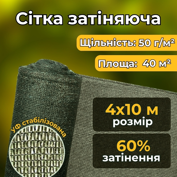 Сітка затіняюча Agreen з рівнем затінення 60% використовується для часткового захисту рослин від сонця, вітру та перегріву. Завдяки розмірам 4×10 м (40 м²) і компактній упаковці у пакеті, її зручно транспортувати й встановлювати. Ідеально підходить для городів, теплиць, парників, садів, а також як тимчасове накриття для відпочинку на відкритому повітрі. Виготовлена з УФ-стабілізованого поліетилену, сітка має тривалий термін експлуатації та стійка до вологи.