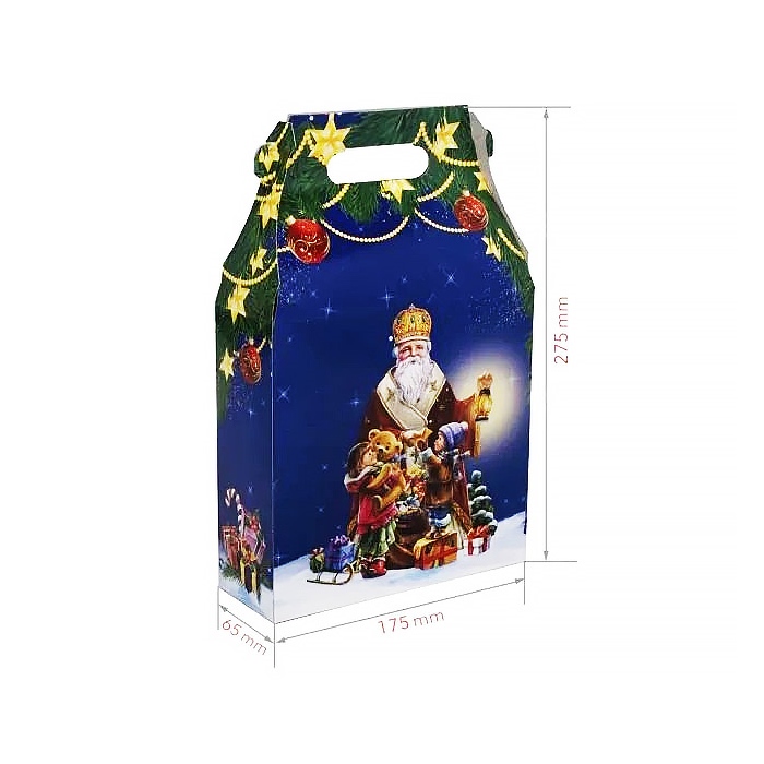 Ця коробка з ручкою прикрашена яскравим зображенням Миколая зі святковими подарунками на синьому фоні. Ідеальна для солодощів або невеликих подарунків на різдво. Вміщує до 700 г солодощів.