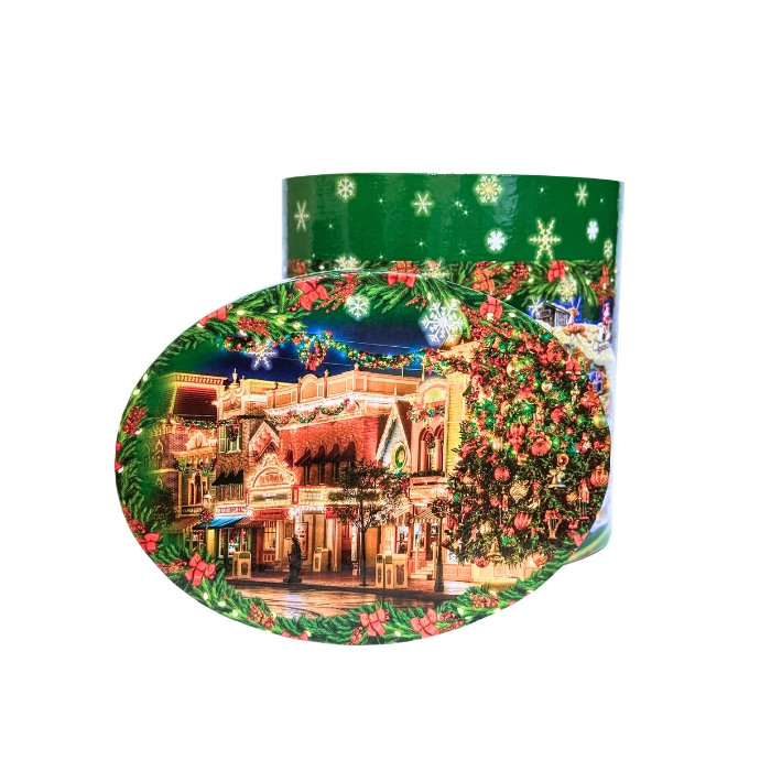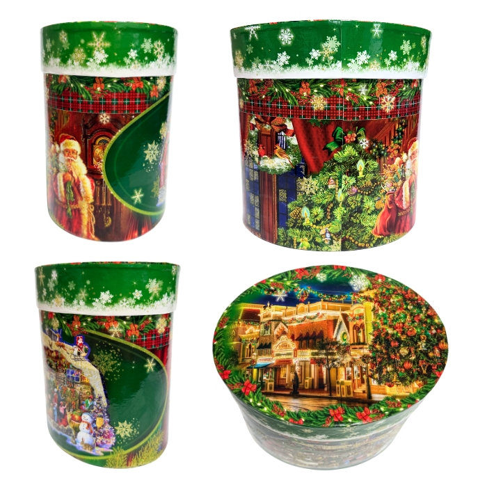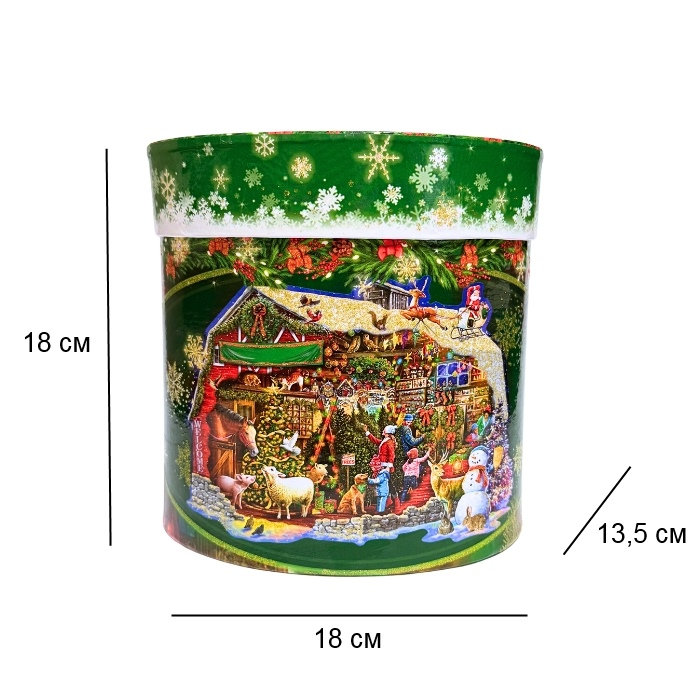 Новорічна коробка у вигляді тубуса зеленого кольору об’ємом 1000 г — стильне пакування для солодких подарунків, сувенірів чи інших святкових дрібниць. Міцний картон надійно захищає вміст, а яскравий святковий дизайн створює новорічний настрій та приваблює увагу. Така упаковка ідеально підходить для корпоративних подарунків, привітань близьких або оформлення святкового столу.