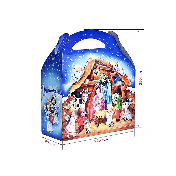 Коробка виготовлена з щільного картону, який добре тримає форму та захищає вміст від пошкоджень. Зручна ручка полегшує транспортування та дозволяє використовувати коробку як яскравий святковий аксесуар.