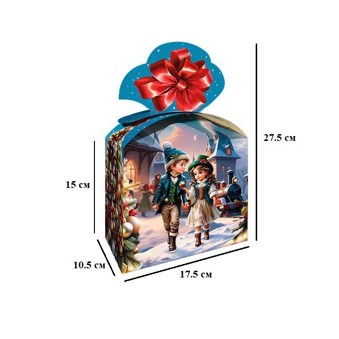 Новорічна подарункова коробка "Станція" — святкова упаковка для солодощів та маленьких подарунків. Виконана з міцного картону із зображенням пари біля зимового паровозика, що додають атмосфері тепла та затишку. Ідеально підходить для подарунків на Різдво та Новий рік.