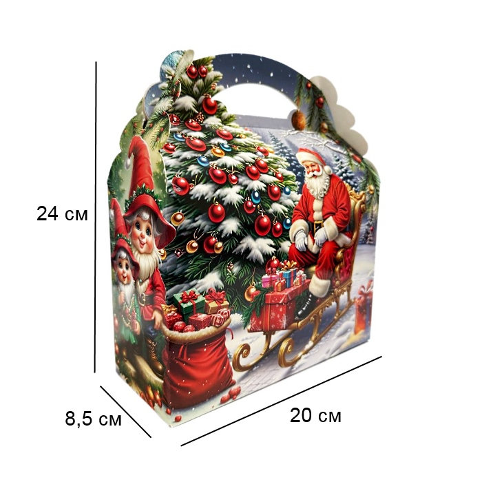 Святкова коробка “Санта з подарунками” створена спеціально для упакування новорічних солодощів та сувенірів. Дизайн із зображенням Санти, який несе подарунки, створює атмосферу радості, свята та очікування дива. Міцна упаковка зручна у використанні, підходить для корпоративних презентів, дитячих подарунків та домашніх святкових наборів.