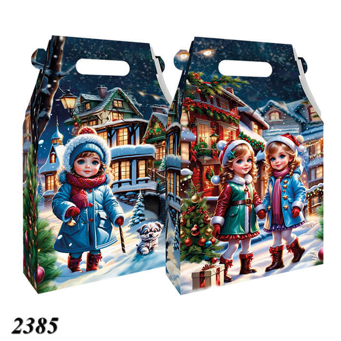 Новорічна коробка “Зимова історія”— святкове пакування з казковими ілюстраціями. На сторонах зображені діти у теплих зимових костюмах, а також милі персонажі — зайчик і ведмедик у святковій атмосфері. Дизайн доповнюють ялинкові прикраси, подарунки та ліхтар, що створює особливий затишок. Міцний картон та зручна ручка роблять коробку практичною й надійною для солодощів та сувенірів.