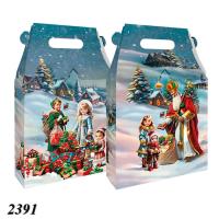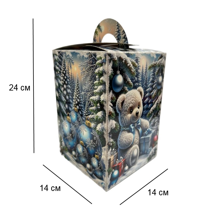Новорічна подарункова коробка розрахована на фасування до 1000 г солодощів. Виготовлена з щільного картону, має зручну ручку для перенесення та яскравий святковий дизайн. На гранях коробки зображені зимові сюжети — ведмедик, сніговик, ялинки, іграшки та ліхтар у синьо-сріблястій гамі. Така упаковка робить подарунок особливим і створює новорічну атмосферу.