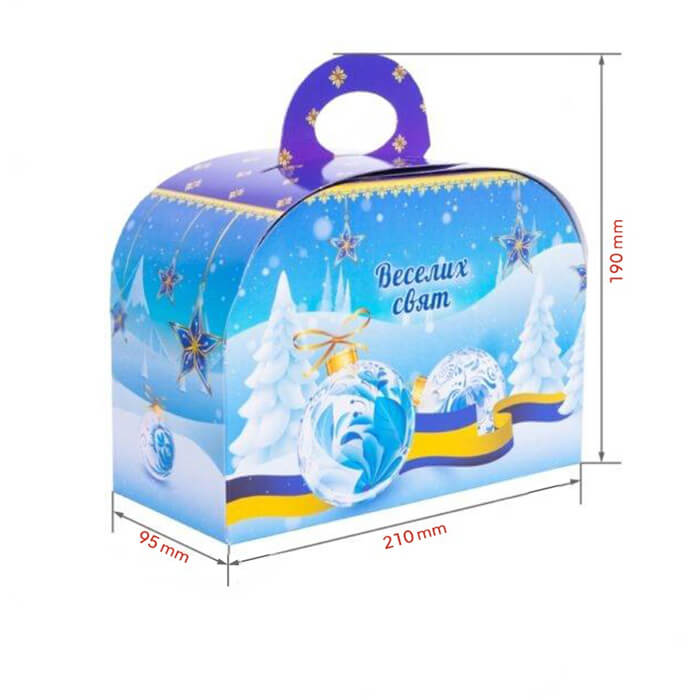 Синя коробка із зимовим пейзажем та написом "Веселих свят" із зображенням кульки з українським прапором. Ідеальна для патріотичних новорічних подарунків.