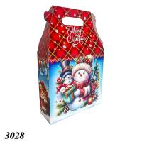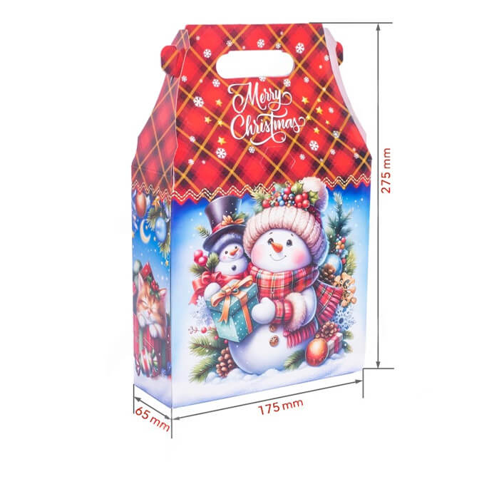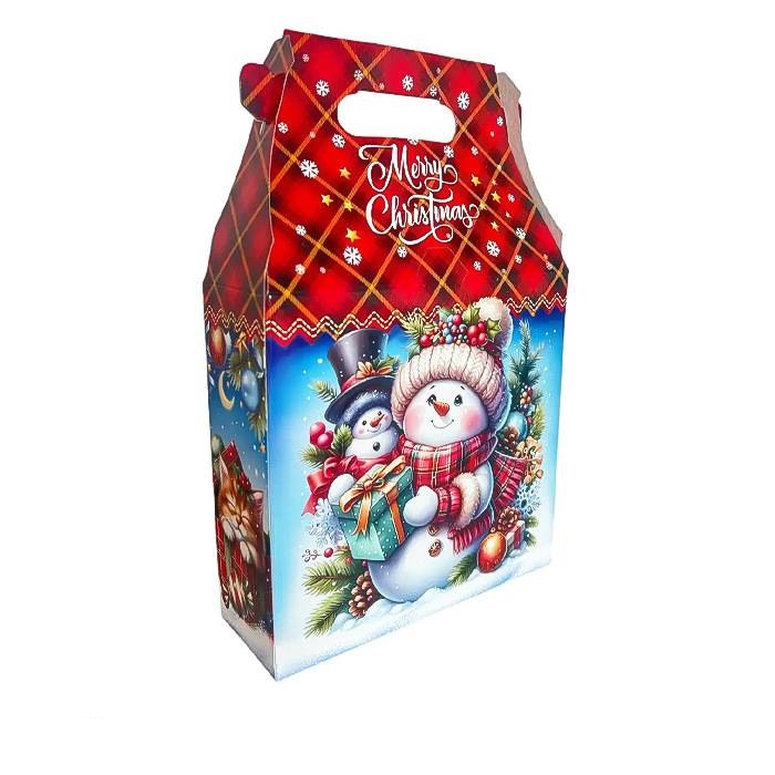 Чарівна коробка "Merry Christmas" з малюнком сніговика в теплому вбранні та подарунком у руках. Прикрашена яскравими зимовими елементами, що роблять її ідеальною для святкового настрою.