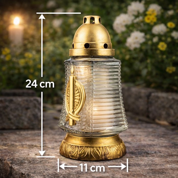Лампадка используется для памяти умерших, устанавливается на кладбище, в храмах или дома для молитвы. Изготовлена из прочного стекла, оснащена пластиковой крышкой, защищающей пламя от ветра. Устойчива к погодным условиям, пригодна для многократного использования. Лампадка с рельефным стеклом. Свеча в комплекте.