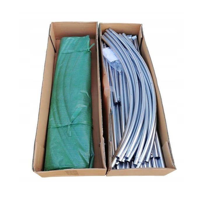 Двенадцать окон с москитными сетками обеспечивают эффективную вентиляцию, а дверь на молнии позволяет удобно заходить внутрь. Теплица легко собирается и отлично подходит для использования на даче или в частном хозяйстве.