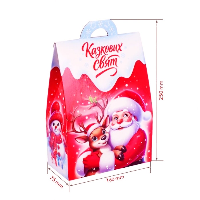 Яркая новогодняя коробка-сумка красного цвета для сладких подарков к праздникам. Емкость – до 600 г конфет. Удобная ручка переноски, плотный картон и праздничный дизайн создадут радостное настроение для детей и взрослых. Идеально подходит для корпоративных и семейных подарков.