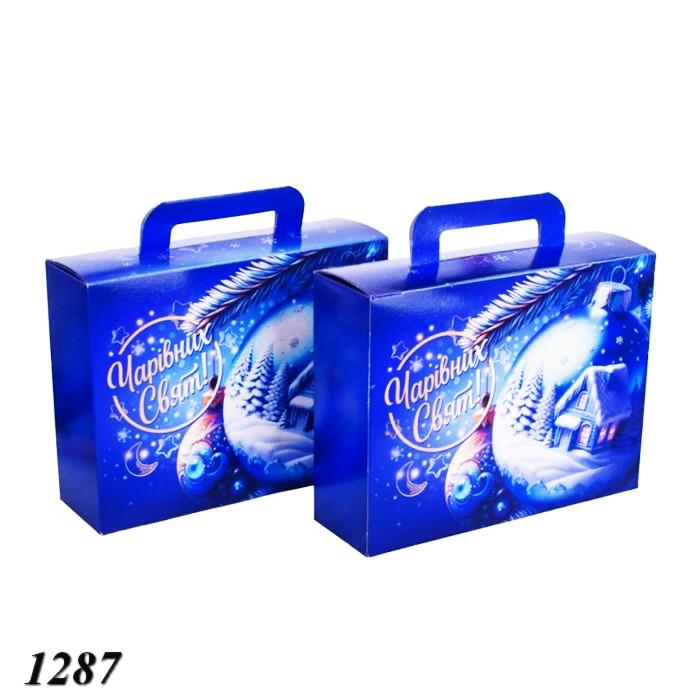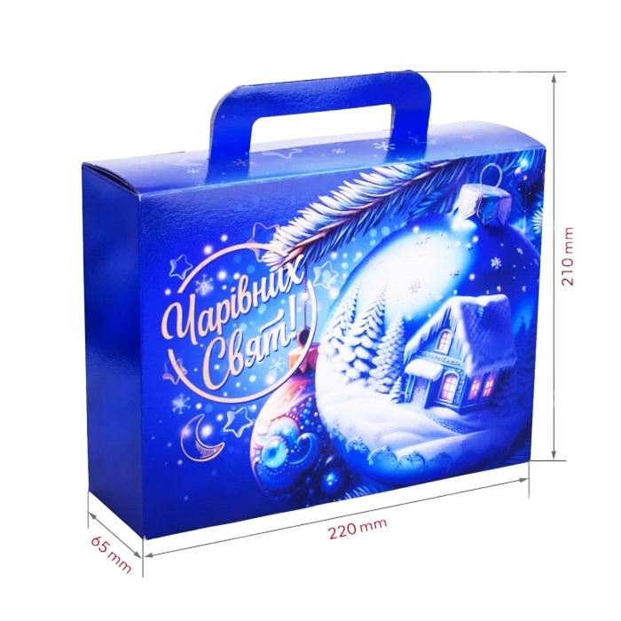 Новогодняя коробка-сумка с ручками «Новогодняя игрушка» для сладких подарков. Емкость – 900 г конфет. Выполнена из прочного картона, удобна в переноске, имеет яркий праздничный дизайн с тематическими рисунками. Идеально подойдёт для детских и корпоративных подарков.