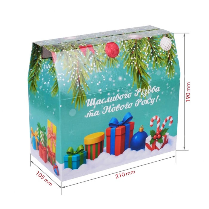 Новогодняя коробка «Саквояж» для сладких подарков рассчитана на 1500 г конфет. Выполненная из плотного картона удобная форма с ручкой и праздничный дизайн делают ее идеальным выбором для детских, семейных и корпоративных подарков.