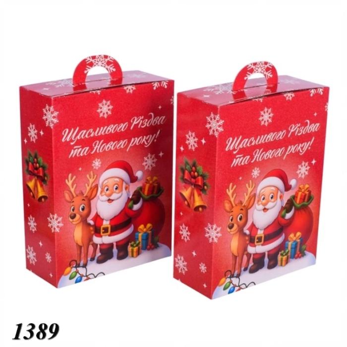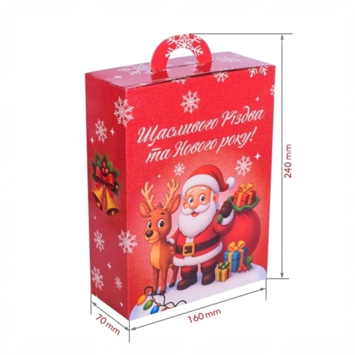 Новогодняя коробка прямоугольной формы красного цвета для сладких подарков. Вместимость – 800 г конфет. Выполнена из плотного картона, имеет праздничный дизайн и удобную форму. Прекрасный выбор для детских, семейных и корпоративных подарков.