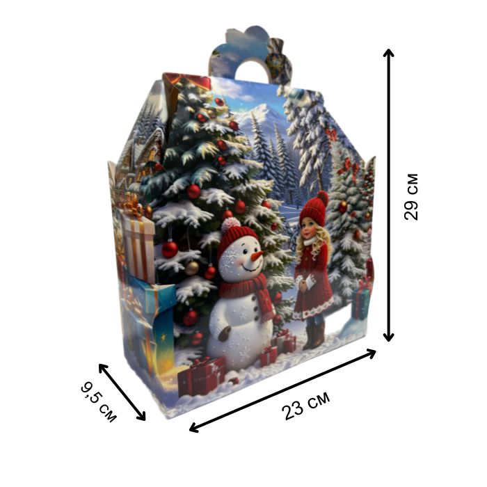 Новогодняя коробка "Дети" для сладких подарков весом до 1000 г. Украшена ярким рисунком с детьми в зимней атмосфере. Крепкий картон и удобная форма делают ее отличным выбором для детских праздников и школьных подарков.