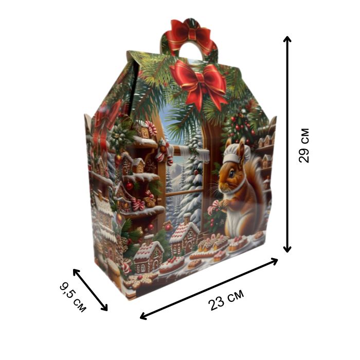 Новогодняя коробка «Белочки» для сладких подарков весом до 1000 г. Изготовлена из прочного картона и украшена ярким узором с белочками, что создает атмосферу зимней сказки. Идеально подходит для детских праздников, семейных и корпоративных подарков.