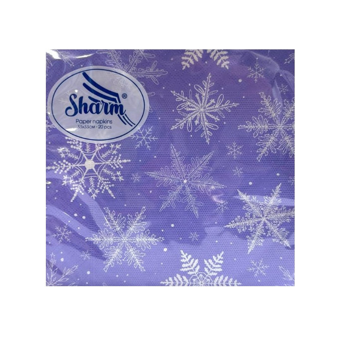Бумажные салфетки Sharm «Снежинки» – набор из 20 двухслойных салфеток с зимним узором. Изготовлены из мягкой целлюлозы, имеют приятную текстуру, хорошо впитывают влагу. Праздничный дизайн со снежинками создает атмосферу зимы и уюта, отлично подходит для новогодней сервировки или кафе HoReCa.