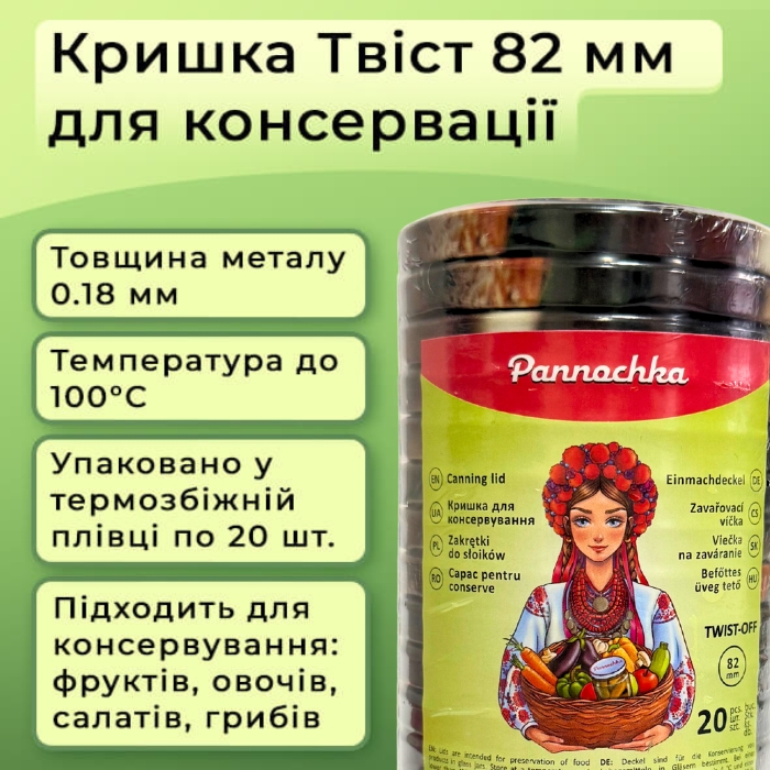 Металлические ЕВРО крышки «Панночка» Грибы диаметром 82 мм — изготовлены из стали с внутренним полимерным покрытием (пищевая эмаль), что обеспечивает защиту продуктов от контакта с металлом и продлевает срок хранения. Тип закручивания – твист-оф, позволяющий герметично закрывать банки вручную без дополнительных инструментов. Идеально подходят как для бытовой консервации, так и для промышленной упаковки в оптовых объемах. Крышка выдерживает температуру до 100 °C.