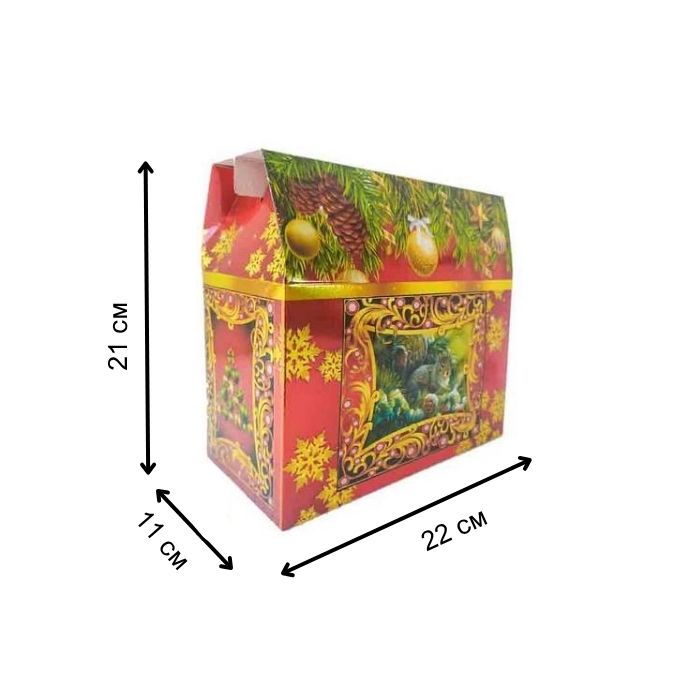 Эта красная коробка с ёлочными украшениями и пейзажами создаёт уютное праздничное настроение. Идеальный выбор для новогоднего подарка в виде конфет. Вмещает до 1000 г сладостей.