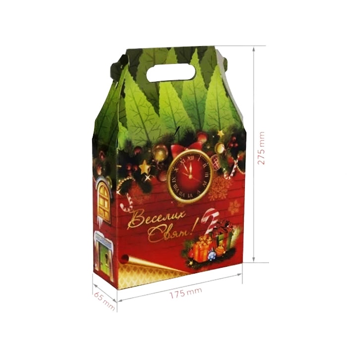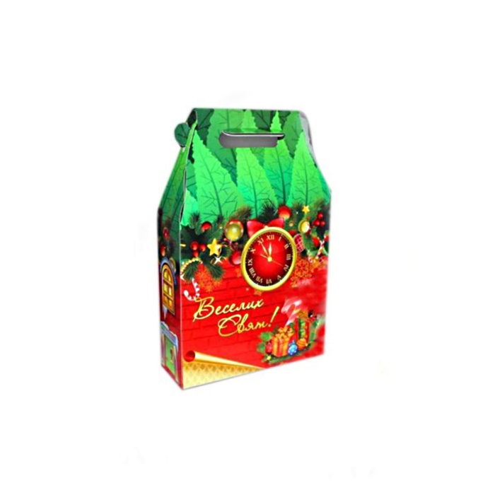 Эта новогодняя коробка среднего размера с ручкой имеет классический красно-зеленый дизайн. На ней изображены часы и праздничные гирлянды, придающие атмосфере обаяния. Коробка отлично подходит для хранения сладостей или маленьких подарков. Вмещает до 700 г сладостей.