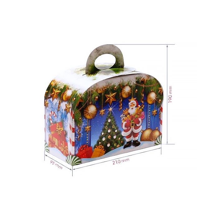 Эта коробка в форме чемодана украшена ярким изображением новогодней елки с украшениями, Сантой и подарками. Синий фон добавляет праздничную атмосферу зимней сказки. Вмещает до 900 г сладостей.