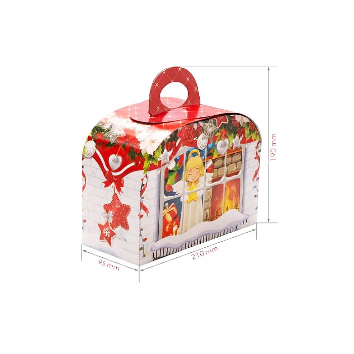 Эта новогодняя коробка имеет форму чемодана с ручкой и украшена изображением зимнего окна с Санта-Клаусом, новогодними украшениями и теплыми световыми элементами. Она идеально подходит для упаковки сладостей или подарков. Вмещает до 900 г сладостей.