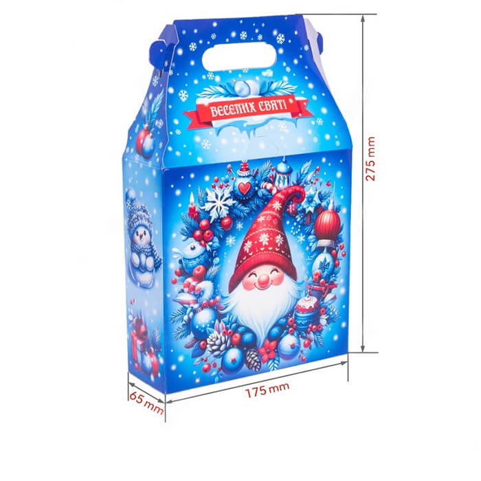 Яркая новогодняя коробка с изображением Эльфа на синем фоне, окруженного новогодними украшениями. Идеальна для создания праздничного настроения и упаковки сладких подарков.
